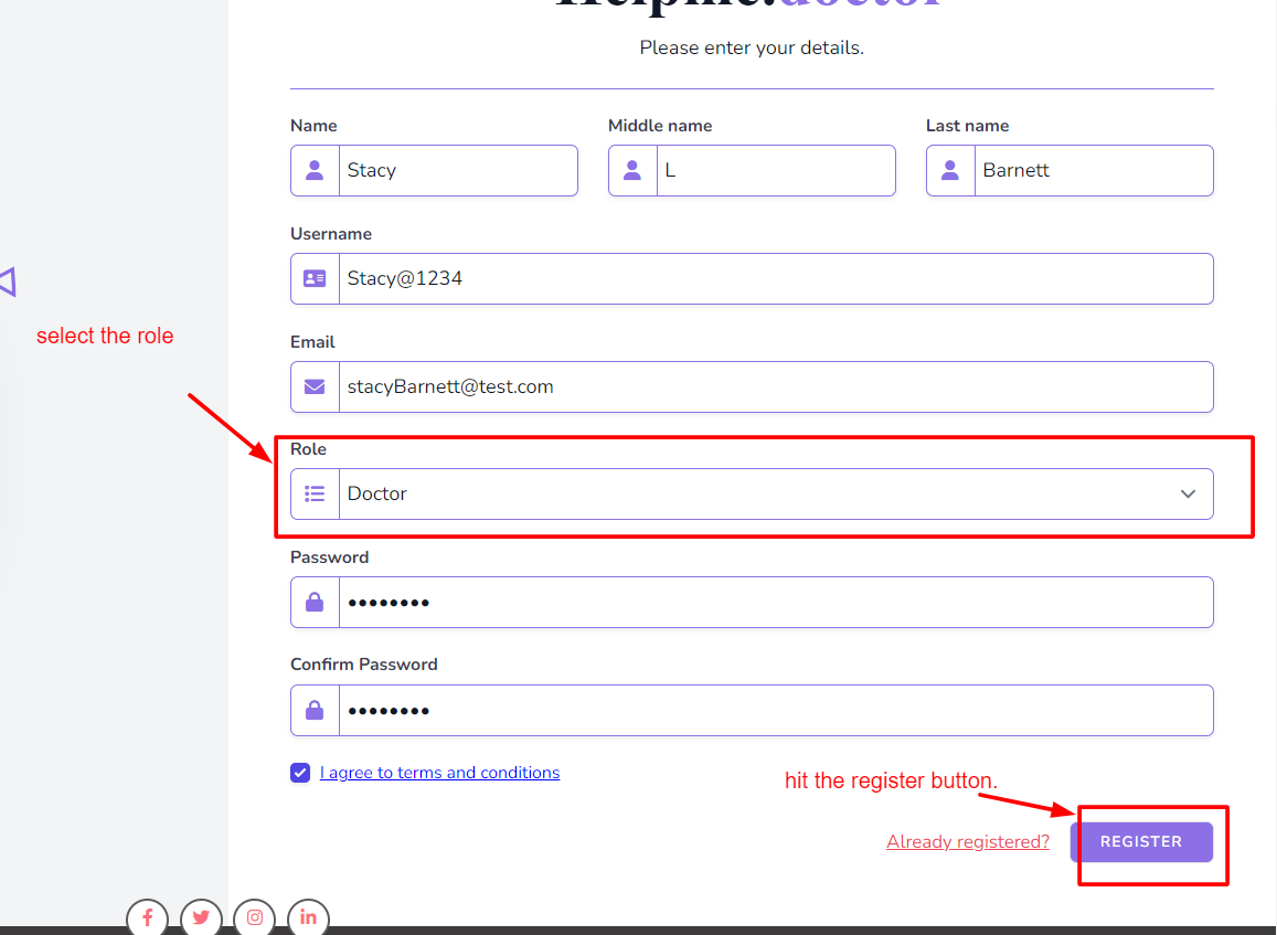 2. Fill up the form select the role if you want to join as a patient or as a doctor, and hit the register button.