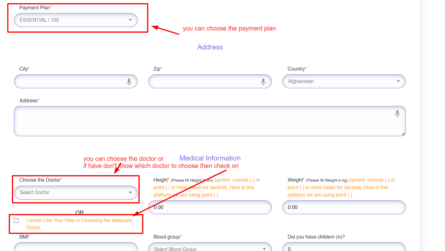 3. Select the payment plan, and choose the doctor if you want someone from our team to help you with that. Then you can choose the "I would Like Your Help in Choosing the adequate Doctor".